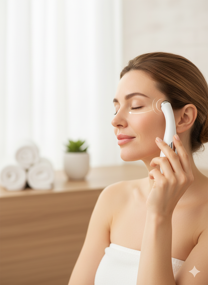 For an instant 'eye-lift' effect, store your Eye Massager in a skincare fridge or a cool place for 10 minutes before use. The combination of cold therapy and sonic vibration creates a powerful lymphatic drainage effect, instantly shrinking bags and tightening the skin for a wide-awake, luminous look