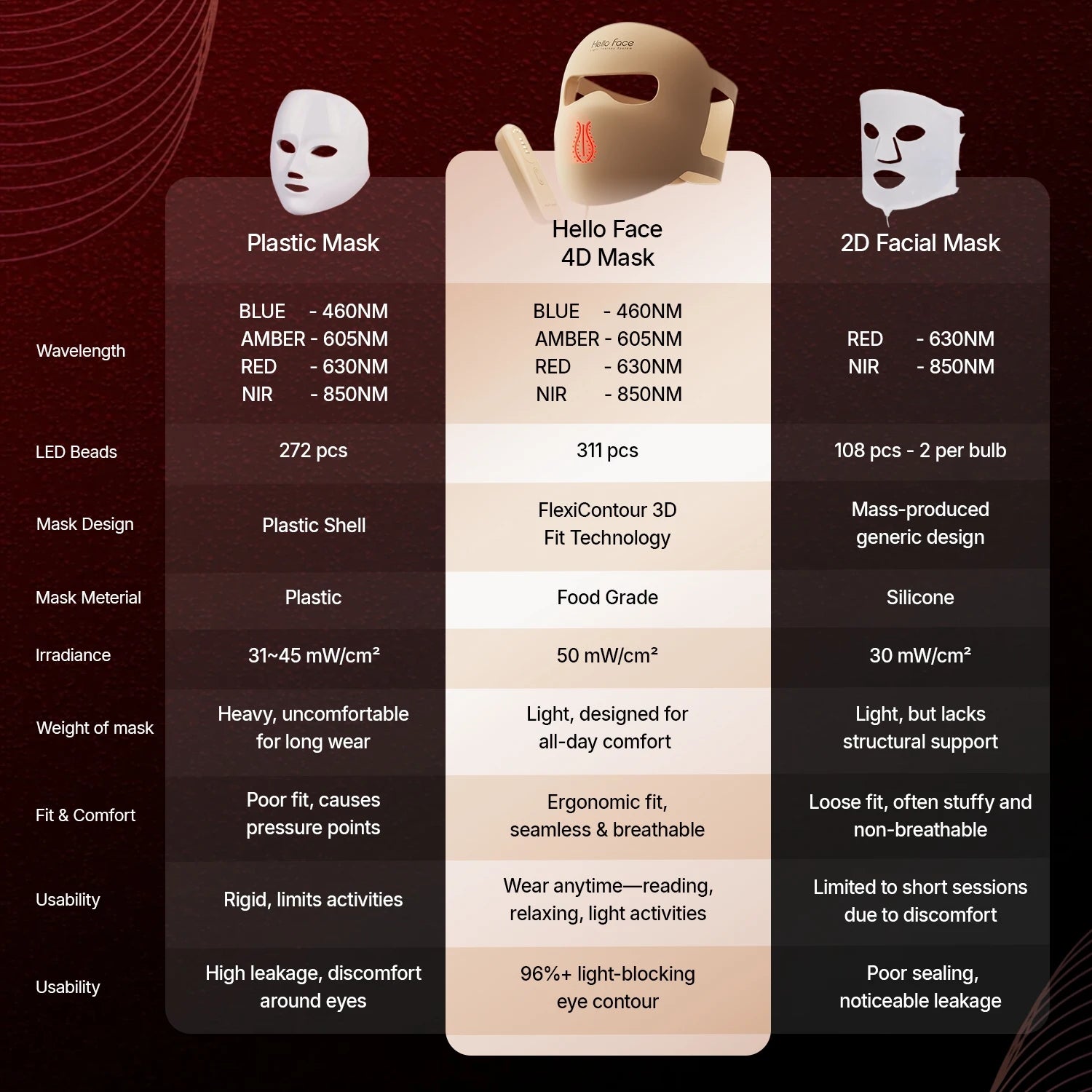 The Hello Face M300 takes the guesswork out of light therapy. With 4 dedicated treatment modes and a 4D-contouring silicone design, it effectively treats signs of aging, active breakouts, and dullness simultaneously. It is designed for the modern user who demands professional results without the rigid, uncomfortable constraints of traditional hard-shell masks.